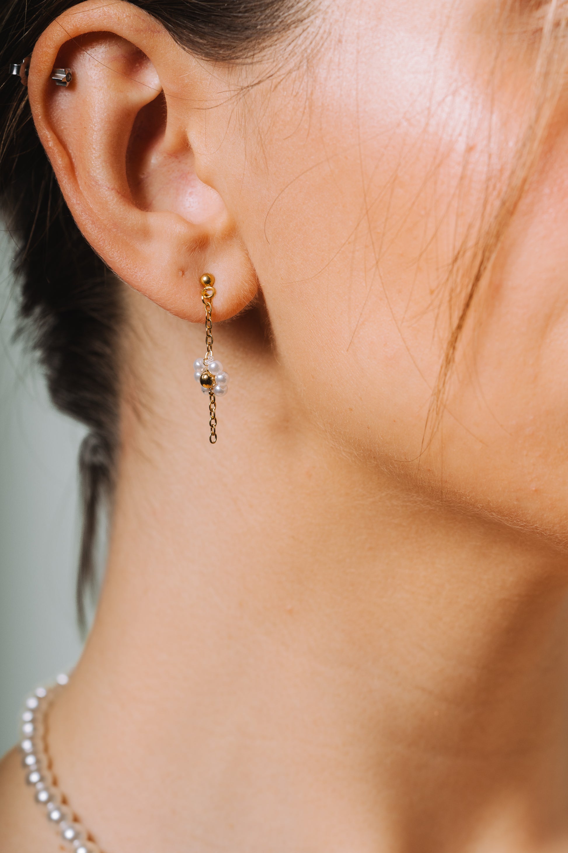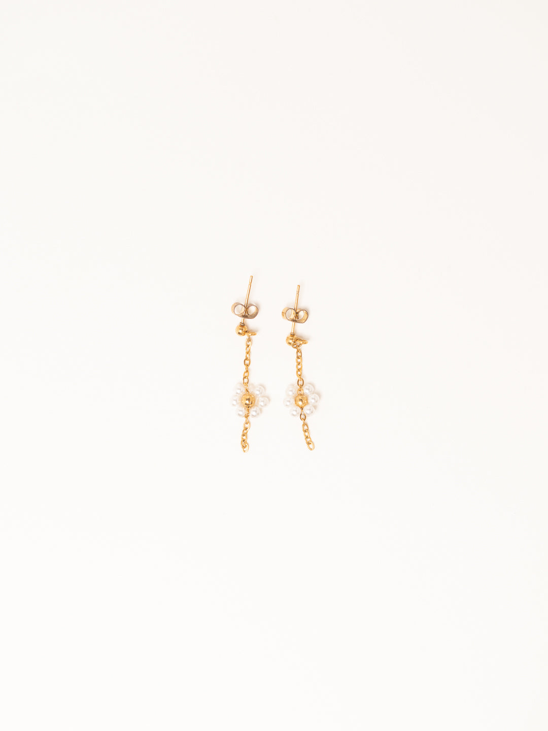Brincos com uma delicada flor em pérolas de aço inoxidável