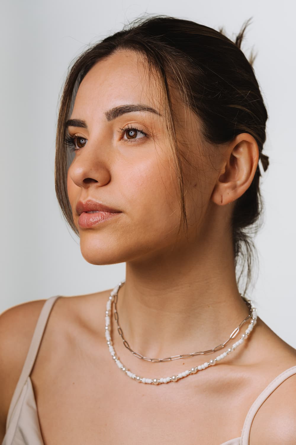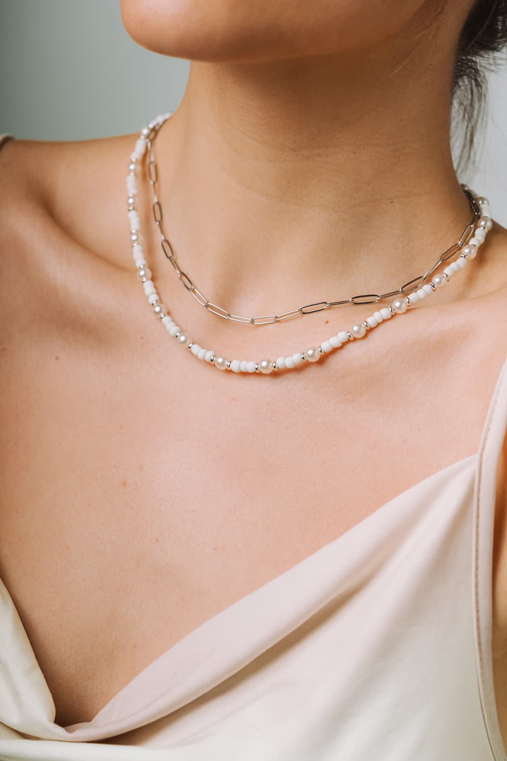 Colar com dois fios juntos, com separação de pequenas pérolas
